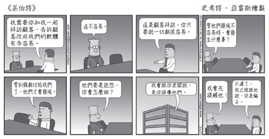 但是如果呆伯特先向老闆抱怨,就會保有自己的信譽,不管後來誰說他是騙子,老闆都很難相信。在說服的三維世界裡,先發制人就能發揮重大影響力。