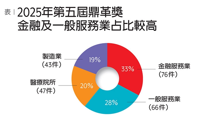本屆鼎革獎在經過近3個月的徵件後,一共收到232件報名(含ESG特別獎及AI應用特別獎),以金融服務業76件最多,占33%;其次是一般服務業66件,占28%;醫院則有47件,占20%;而製造業則為43件,占19%。