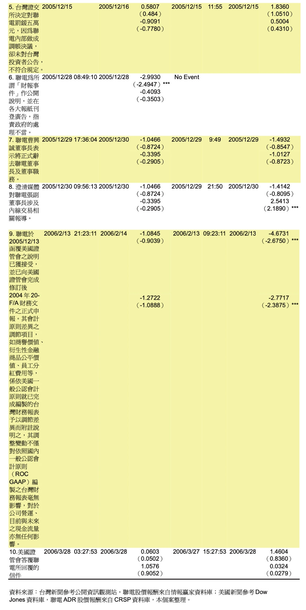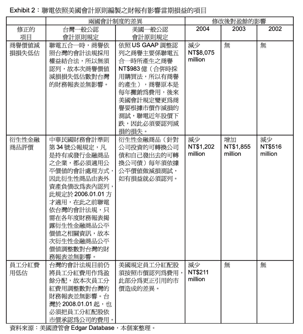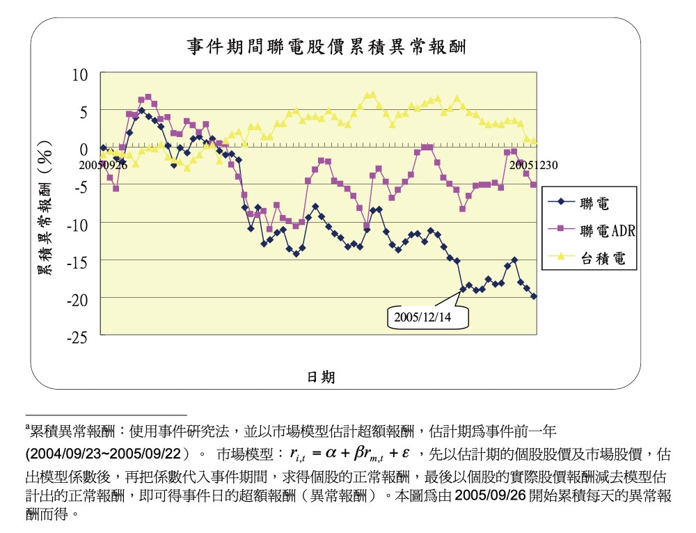本個案內容是描述 2005 年 9 月 23 日美國證管會來函,要求聯電「改善財報表達形式」。信件內容針對聯電的財務報表提出 10 點建議,希望聯電做詳細的說明或者修改其財務報表。由信中的語句可以嗅出,美國證管會是以非常客氣、有禮貌的態度對聯電的財報提出建議和評論。聯電並未在第一時間讓台灣的投資人知道這個消息,因為聯電認為財務報表中要更改的三個項目:商譽減損、衍生性金融商品的評價以及員工分紅的費用,對聯電台灣財務報表的盈餘並無影響,也沒有造成公司的現金流出,不會傷害到公司的體質。但當台灣證交所要求聯電以重大訊息發佈這個訊息時,聯電在台灣的股價有明顯的下跌,Exhibit 6 指出此事件中的幾個重要事件日,聯電在台股的股價下跌幅度明顯大於聯電 ADR 的股價反應,由 Figure 2 也可看出在此事件期間,聯電台股的累計超額報酬約為-20%,和其 ADR 或台積電的台股超額報酬有顯著的差異。
