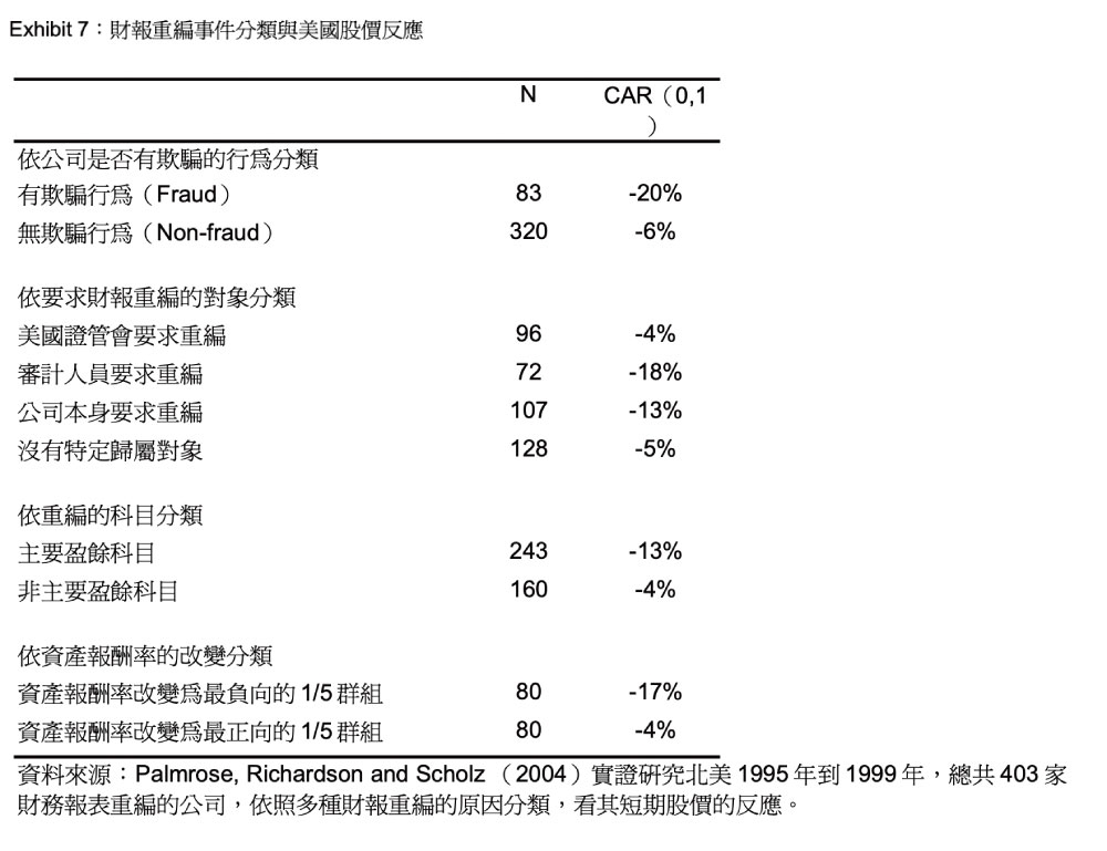 回顧過去的文獻,Palmrose, Richardson and Scholz (2004)研究北美1995 到1999 年間403 個財務報表重編的事件,把財報重編的原因分類,看投資人對財報重編公司的股價反應。實證研究結果整理在Exhibit 7,若重編是因為公司有欺騙的行為、應審計人員或者公司本身的要求、主要的盈餘項目調整、重編後公司盈餘向下修正的情況下,財報重編事件宣告日前後的股價會呈現下跌的走勢;因為美國證管會(SEC)的要求而重編財務報表的公司,反而投資人給予的評價沒那麼差。因此這次聯電的財報重編事件,主要原因為台美會計制度的不同所導致,依據此文獻的結論,應該不至於造成股價大幅的下跌才是,也可看出台灣的投資人確實不太理性,不過有部分要歸咎於聯電揭露此事件的時點,以及和政府之間的關係不融洽。