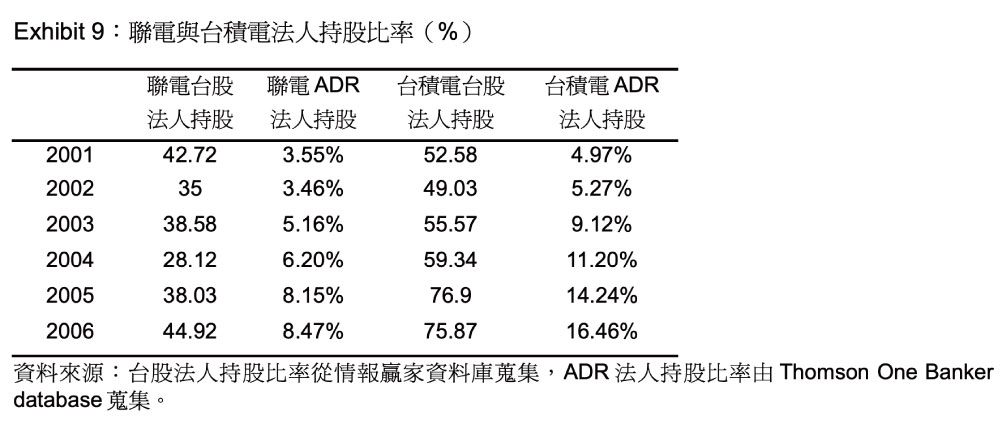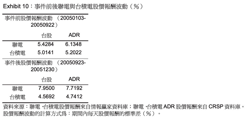 Exhibit 9 為聯電與台積電的投資人結構,可看出從2001 年到2006 年,聯電和台積電的台股法人持股比率都遠高於ADR 的法人持股比率,這和台美股票市場的投資人結構剛好相反。Exhibit 10 為聯電與台積電在事件前(2005 年1 月3 日至2005 年9 月22 日)與事件後(2005年9 月23 日至2005 年12 月30 日)的股價報酬波動比較,可以看出在事件前,聯電的ADR股價報酬波動比台灣大,但在事件期間就是聯電的台灣股價報酬波動較大,可見這個事件對聯電台灣的股價有重要的影響力;而台積電的股價報酬波動都是ADR 較大,且聯電的股價報酬波動不論在哪個時期都高於台積電的股價報酬波動,也證明了投資人型態與股價波動之間的關係的確無明確的結論,但散戶投資人畢竟無法像專業法人可以得到較正確和即時的公司資訊,此時公司本身的資訊透明度就非常重要了。