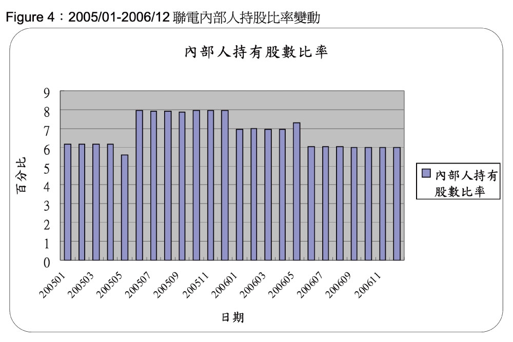 Figure 4 為聯電2005 年1 月到2006 年12 月的內部人持股變化圖,可以看出其內部人持股比率在2005 年6 月到2005 年12 月甚至比其他月份為高,其中2005 年10 月的內部人持股數目比2005 年9 月多了18,744,242 股,2005 年10.11.12 月份則沒有太大差異。可見媒體報導聯電張副董事長自2005 年9 月28 日至2005 年10 月5 日處分聯電持股,疑似為內線交易事件的可信度值得商榷。Exhibit 6 可看出聯電澄清內線交易事件當天(2005/12/30),其台灣和美國的股價都以小跌收盤。