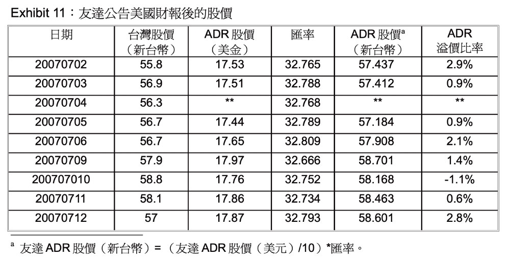 在 Exhibit 1 整理了事件期間聯電台美的日股價、ADR 溢價比率及匯率,可看出在事件期間聯電ADR 的溢價幅度介於13-20%之間,再加上個案中的附註2、3、4 提到的交易成本、轉換期間、美股融券的規則等,綜合這些資料,可以讓學生計算在事件期間中能否進行套利。