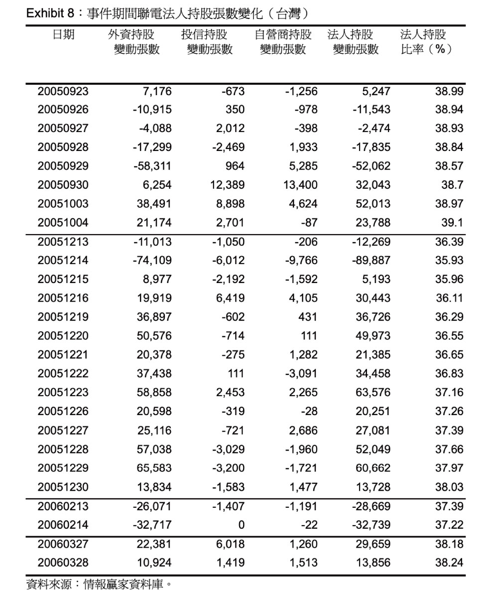 由 Figure 2 可知,聯電台灣的股價從2005 年9 月底到2005 年12 月底,短短3 個月間累積異常報酬達到約-20%,但聯電ADR 的股價在同樣的期間內僅有-5%的累積異常報酬,兩者間差異甚大,可見台美投資人對此一事件的解讀有很大的差距。Exhibit 8 也顯示外資在事件期間內,尤其是2005 年12 月,除了12 月13 日、12 月14 日以外,其他交易日都是呈現買超聯電台股股票的情況,可見聯電2005 年12 月台股故價大幅下跌(Figure 2 的聯電台股累積異常報酬可看出),跟外資比較沒有關係;反而是國內的自營商及投信對聯電比較沒信心,賣超居多,但是整體而言,從2005 年9 月23 日至2006 年3 月28 日,聯電台股的法人持股比率沒有太大的變化。對照相同產業的競爭對手台積電在這段期間的股價報酬是正的走勢,可見聯電有如此負面的報酬並不是因為產業循環或者台股大環境的影響,應該是因為美國要求其重編財務報表,在美國會計原則的規範下聯電的盈餘大幅虧損所致,亦或許跟聯電把這個訊息公布給台灣投資人的方式和時間點有關。