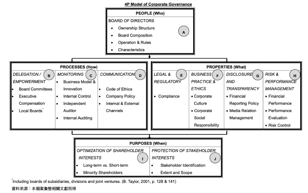 為便於課堂討論,本個案根據相關文獻將公司治理之架構以下列4P Model予以呈現: