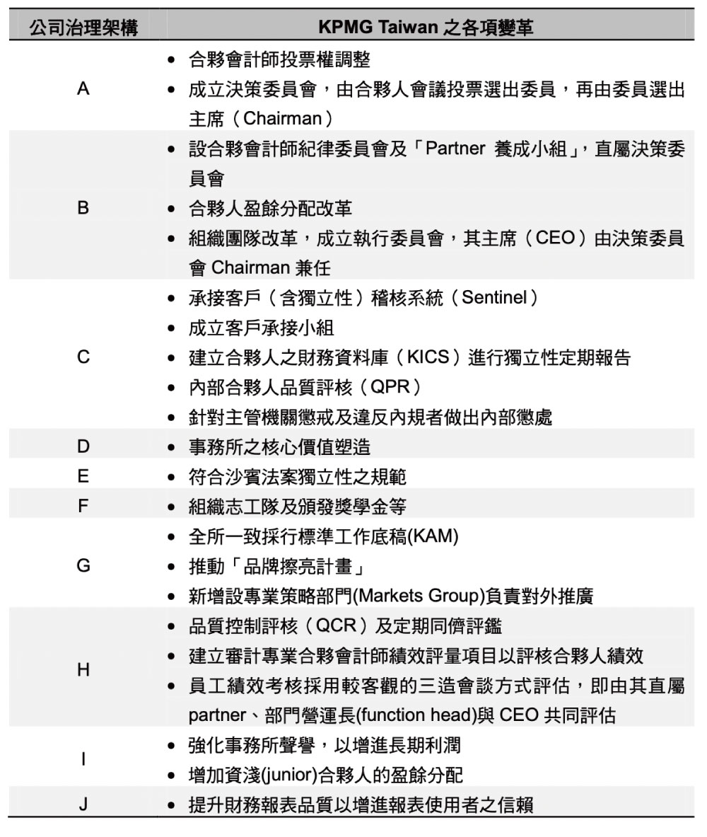 - 會計師事務所之組織治理是否能運用營利公司之公司治理架構?若是,則KPMG Taiwan之各項變革是否能落實公司治理之概念與目的?