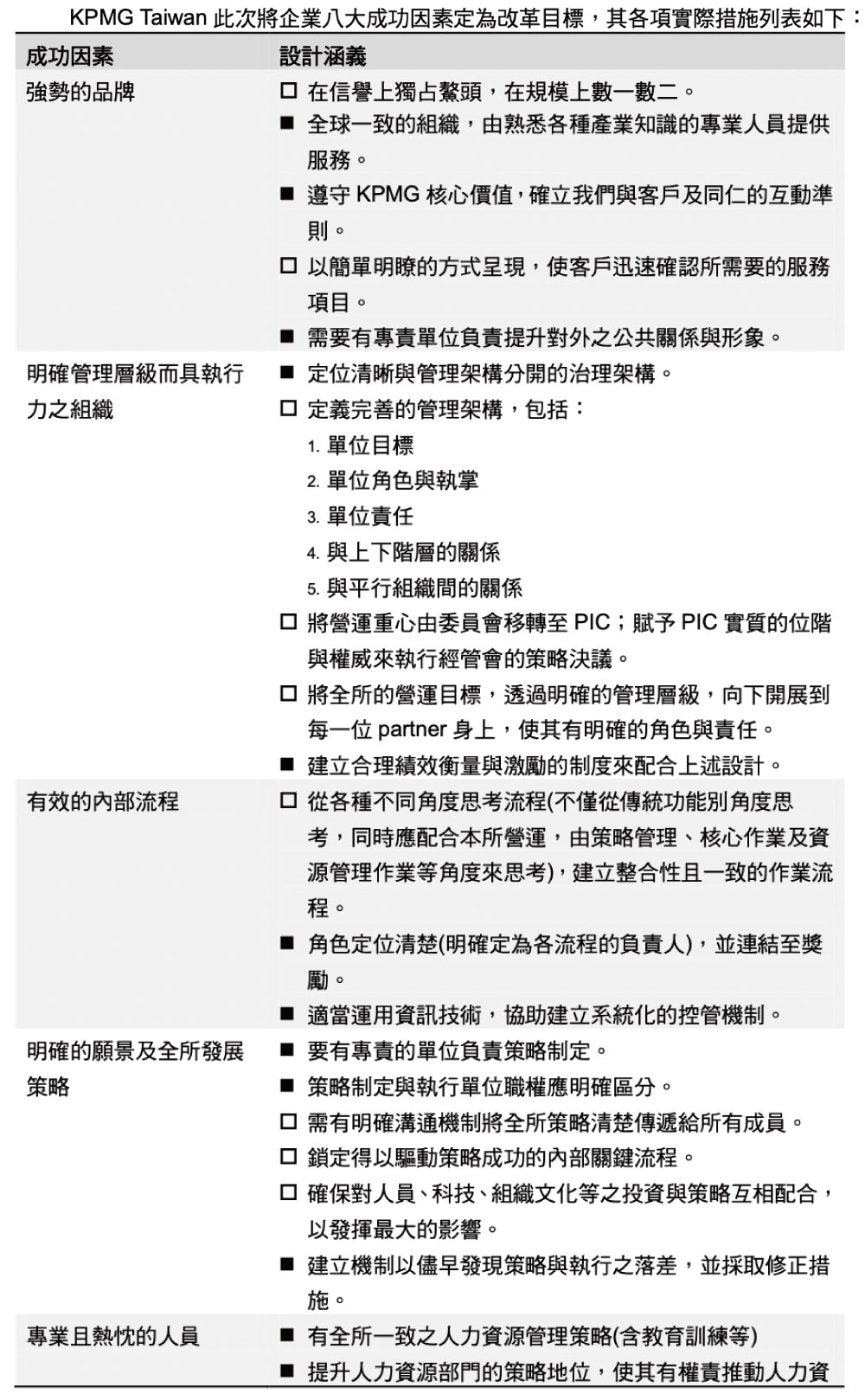 KPMG Taiwan此次將企業八大成功因素定為改革目標,其各項實際措施列表如下: