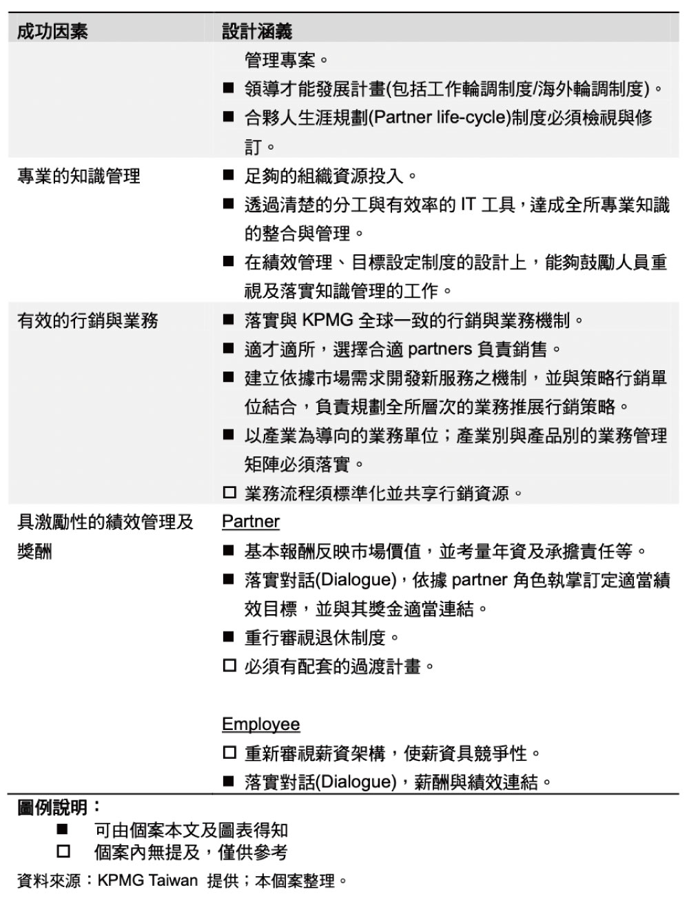 - KPMG Taiwan的合夥人投票權與盈餘分配制度設計,其目的為何?又合夥人之報酬制度該如何設計才能使事務所達到較高的績效?