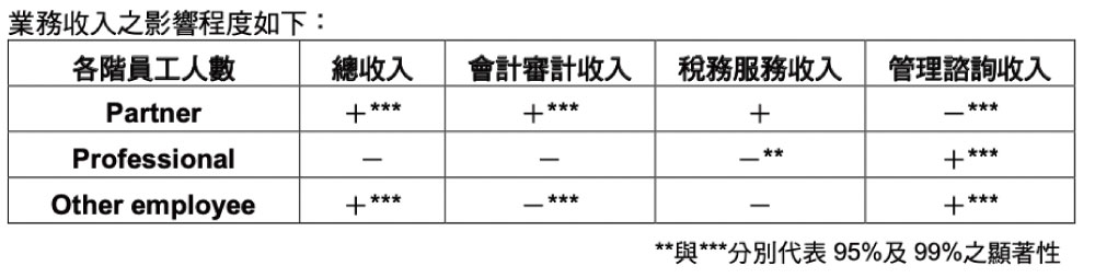 而在學術文章部分,Banker et al. (2003)研究1995年到1999年之美國審計市場,並說明實務調查指出partner、professional與other employee的compensation比率是6:2:1,而其所產生的邊際貢獻為18:2:1。且此研究實證發現各類員工人數對事務所不同業務收入之影響程度如下: