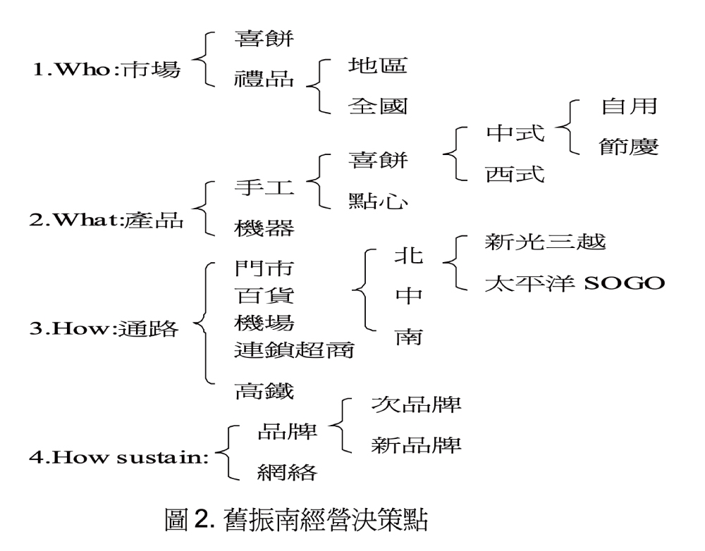 等順序,但是以實際來看,是隨機的(Random、Emergent),對於策略的浮現之觀點一直是存有計畫(Planned)與隨機(Emergent)觀點之差異,舊振南餅店因李董事長擴充通路到百貨據點,而修正產品來適應糕點市場,而不是喜餅市場,這在以前是沒有的,在顧客方面則考慮禮品、旅遊、觀光、與商務的市場。
