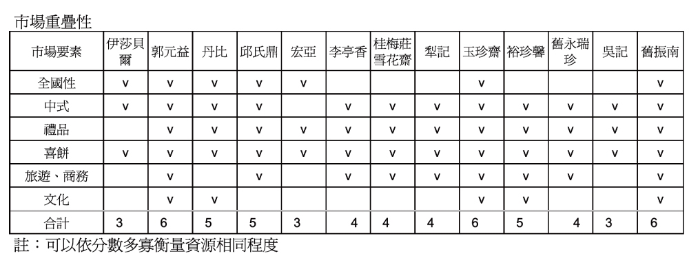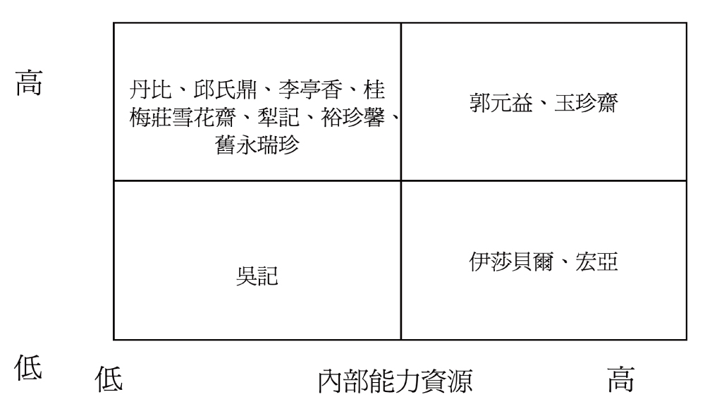 C.以策略空間來表現相似度高的廠商有郭元益與玉珍齋,應從市場區隔與資源差異化來創造與同業之差異性,可以策略群組分析如下圖,以作為策略方向之參考。