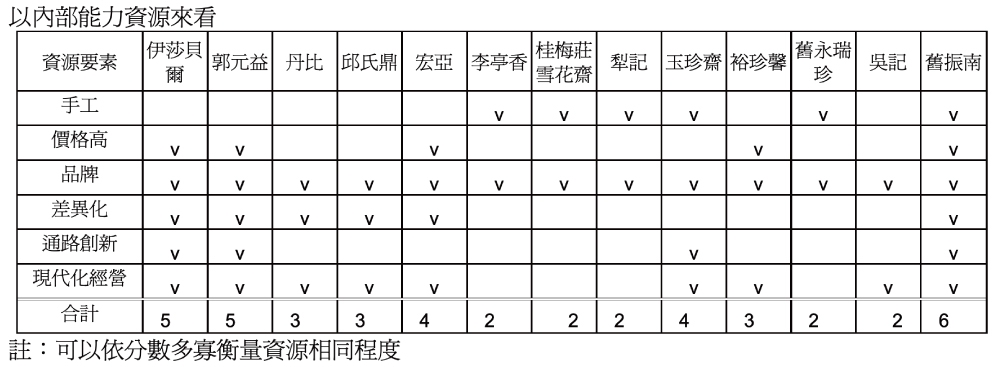 (2)就Position而言,強調資源包括商譽、技術、互補、財務、結構、市場佔有率及組織邊界,這些在舊振南餅店發展的過程中是相當具有解釋力的,在商譽方面沿用舊振南品牌,在中式喜餅發揮互補資源效果,在組織邊界方面延伸。