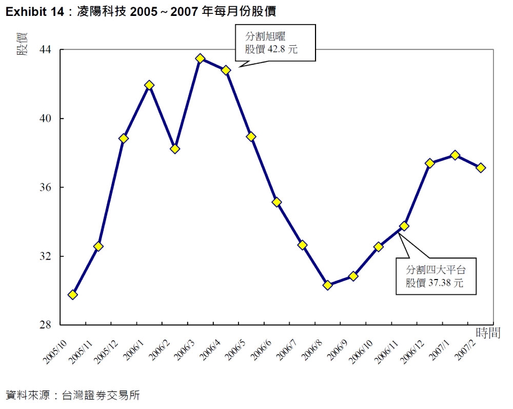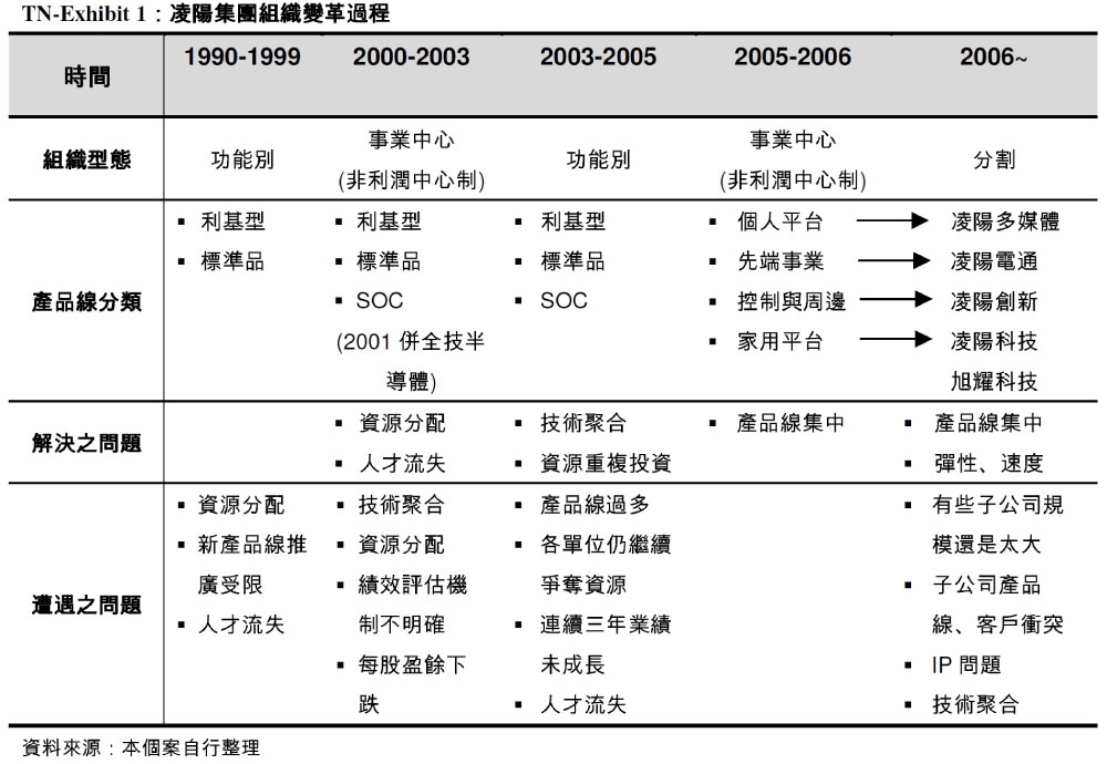 1990-2006年分割前,凌陽科技的組織經歷四次改變,從功能別組織改為事業中心制;又從事業中心制改回功能別組織;最後,2005年又回到事業中心的經營方式(詳見TN-Exhibit 1)。