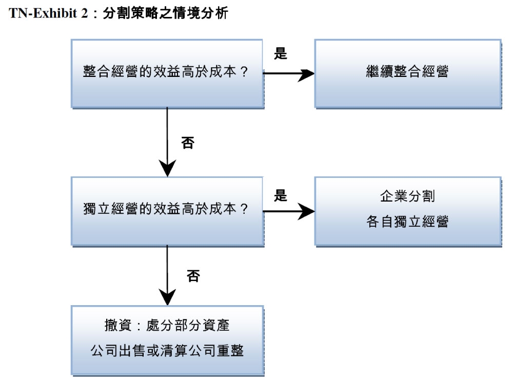 (2) 產生母子公司利益衝突:分割後,母子公司或子公司間的營運範疇或合作方式,可能都會導致經營重疊,如產品線、市場或客戶等,而產生集團內利益衝突。