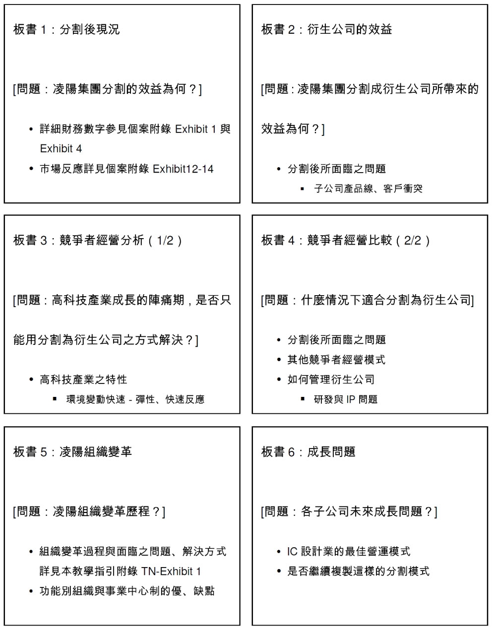 延續對凌陽集團分割案的討論,教師可以將問題拉到怎樣的情境適合執行分割的成長策略?而分割後又該如何設立管理機制?分割後的組織成長議題將如何延續?高科技產業是否適用分割的成長策略?或分割策略是否適用於其他產業?藉此讓學員對分割策略有一概括性的認識與了解。