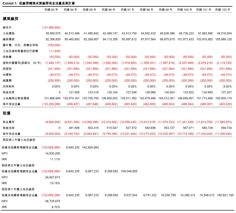 以下先分析租和買廠房的現金流量差異,接著計算這個個案的資金成本,最後以淨現值法(NPV)及內部報酬率法(IRR)作為評估投資與否的依據。