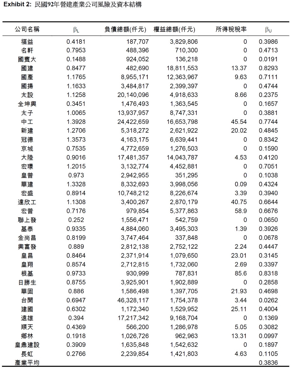 a. 把營建產業公司有負債之下的bL值,分別代入哈馬達公式,轉換成無負債之下的bU值(參看Exhibit 2),平均營建產業無負債之下的bU值(0.3836),當作房地產業無負債下的風險;