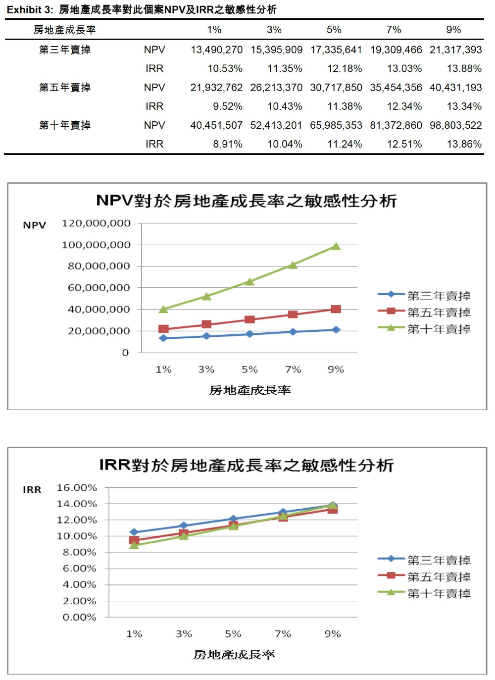 景氣成長率,看此個案NPV及IRR的變化。由Exhibit 3可知,當房地產成長率愈高時,立錡愈晚把廠房及土地賣掉,可得到較高之淨現值;且在第十年才把廠房及土地賣掉的淨現值,受房地產成長率的影響最大。此個案的內部報酬率(IRR)受房地產景氣的影響,也是呈現正向的關係,當房地產成長率愈高,不論何時把廠房及土地賣掉,都會有較高的IRR,但IRR對房地產成長率的敏感程度,在不同賣掉的時間點之間,沒有很大的差異。