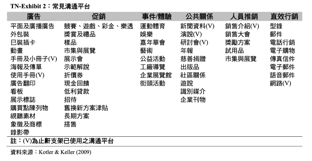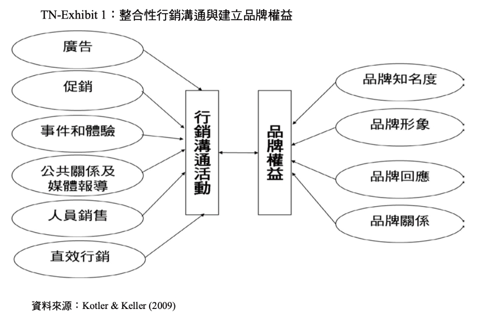 行銷溝通主要由六種傳播模式所建構,包括廣告、促銷、事件和體驗、促銷及直效行銷;行銷溝通也能藉由建立品牌知名度、刻劃品牌形象、對品牌產生回應,並連結品牌關係而對品牌權益有所貢獻,Exhibit 1即呈現出行銷溝通方案對於建立品牌權益的關係。