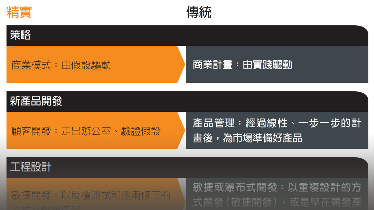 精實創業者不從商業計畫書出發,而是從尋找商業模式開始。經過一連串快速的實驗與回饋意見,找出一個可行的模式後,精實創業家就轉而著重於執行。