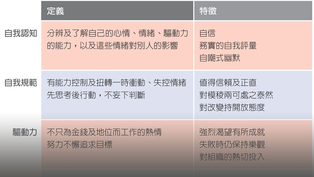 你如何分辨某人有高EQ,或自己是否有高EQ?圖為EQ的每項組成因素:自我認知、自我規範、驅動力、同理心、社交技巧。