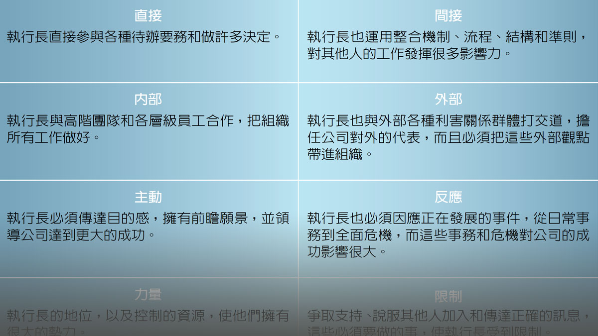 在檢視執行長的角色時,我們發現,他們的工作造成六個影響層面。每一個層面都有雙重性質,也就是看似互相矛盾的性質,類似陰與陽;執行長卻必須同時管理這些雙重性質,才能發揮效能。
